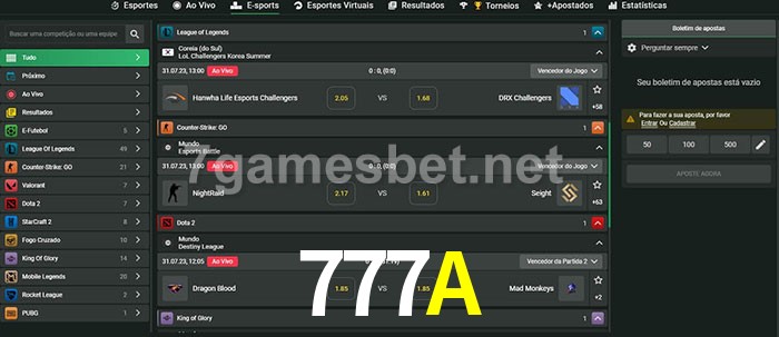 A aposta 777A oferece aos jogadores a experiência mais conveniente de apostas em eSports!